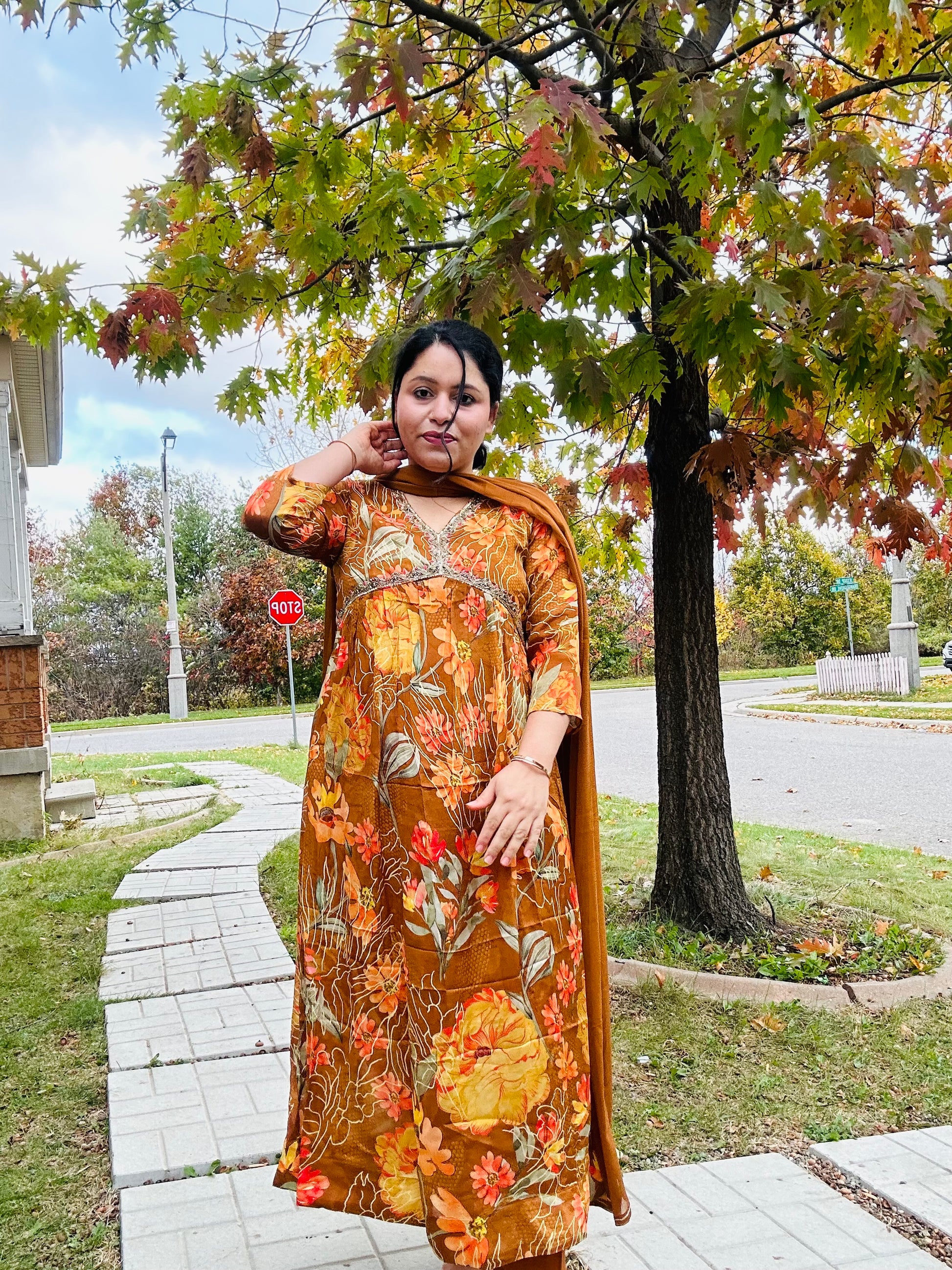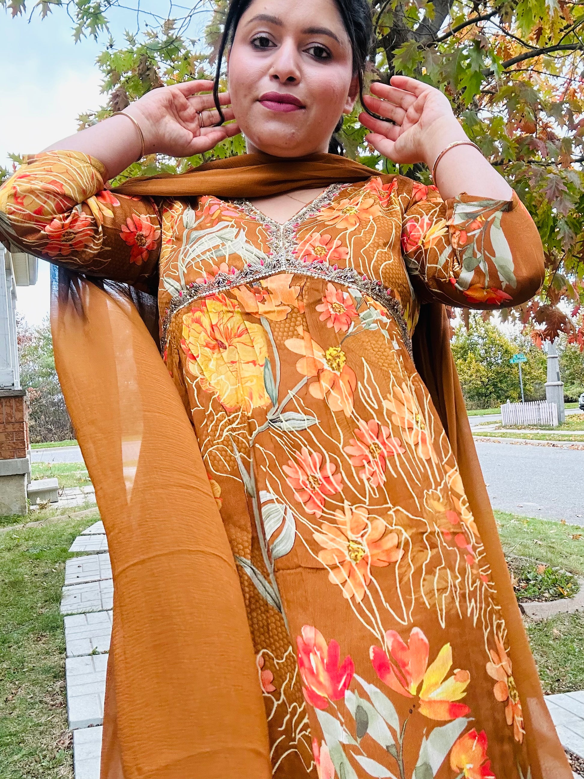 "Expertly hand-embroidered in traditional alia style, the Alia-Camel ensemble boasts camel-colored cutdana and sequins on pure chinon fabric. This sophisticated set includes a chiffon duppata and straight pants with pockets, making it both elegant and functional. Hand washable for easy maintenance."