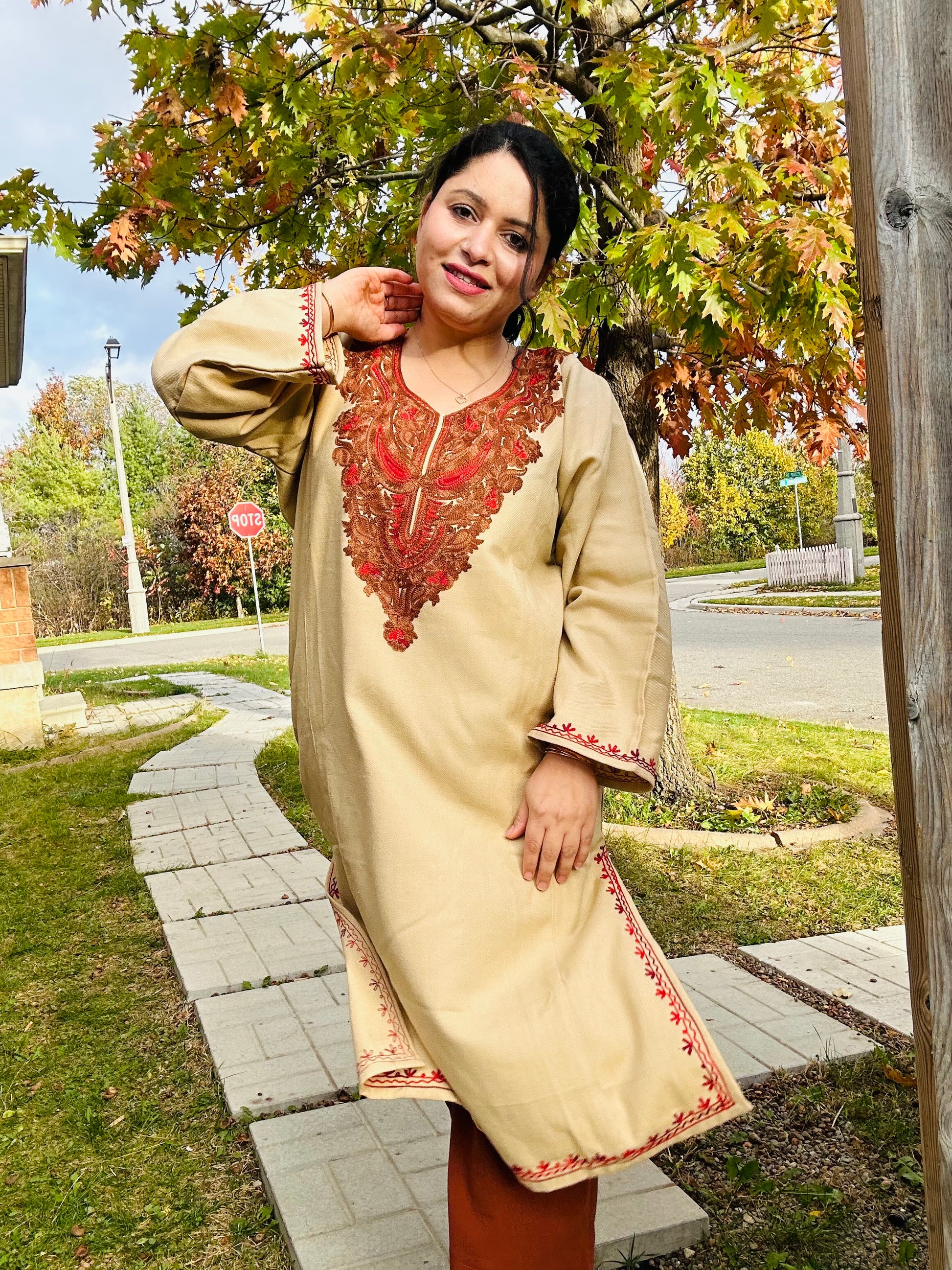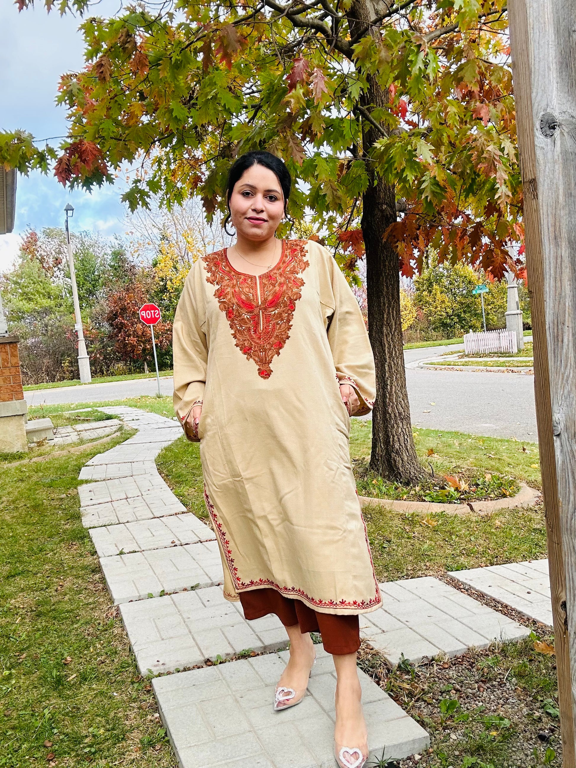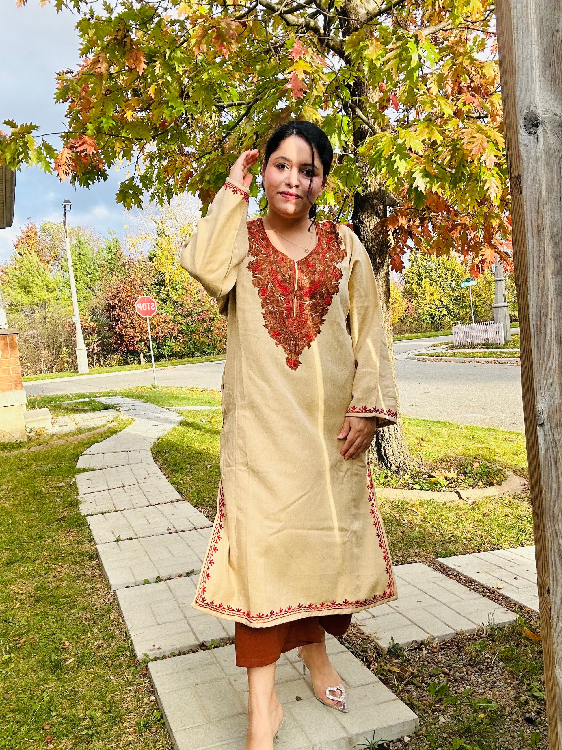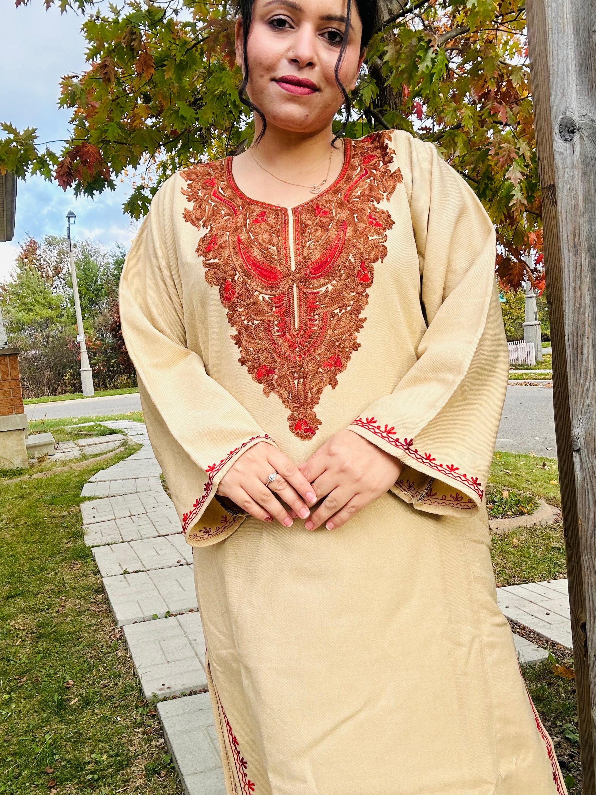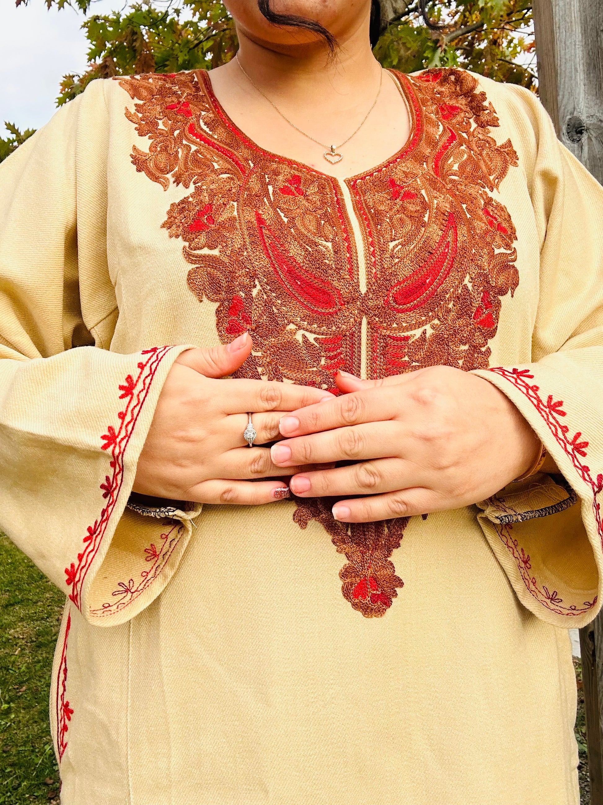 Experience the luxurious warmth and exquisite hand embroidery of Kashmiri kali. Made from authentic Kashmiri pashmina, this scarf is a must-have for cold weather. Stay stylish with the added convenience of pockets, available in black, beige, and cream.