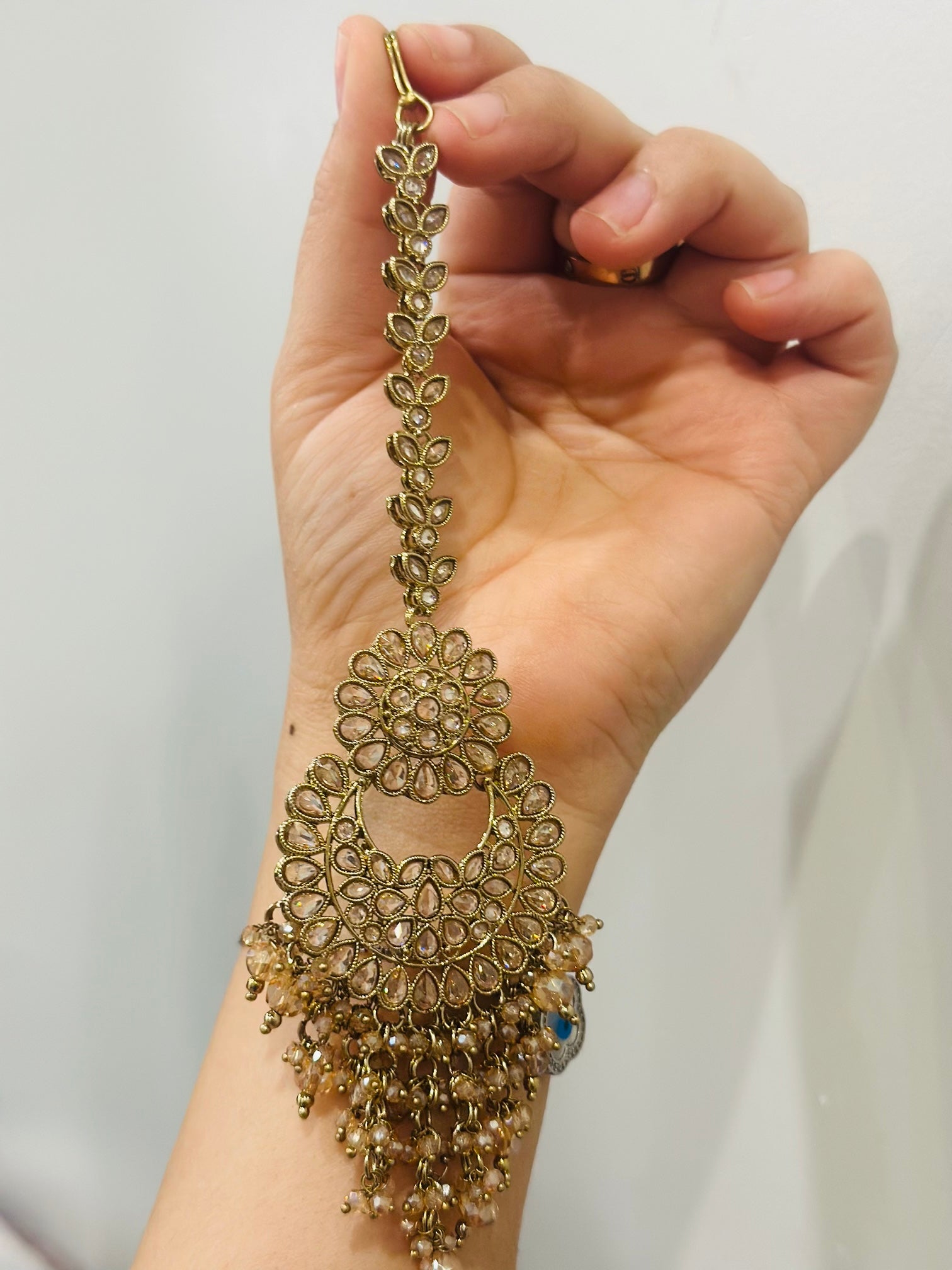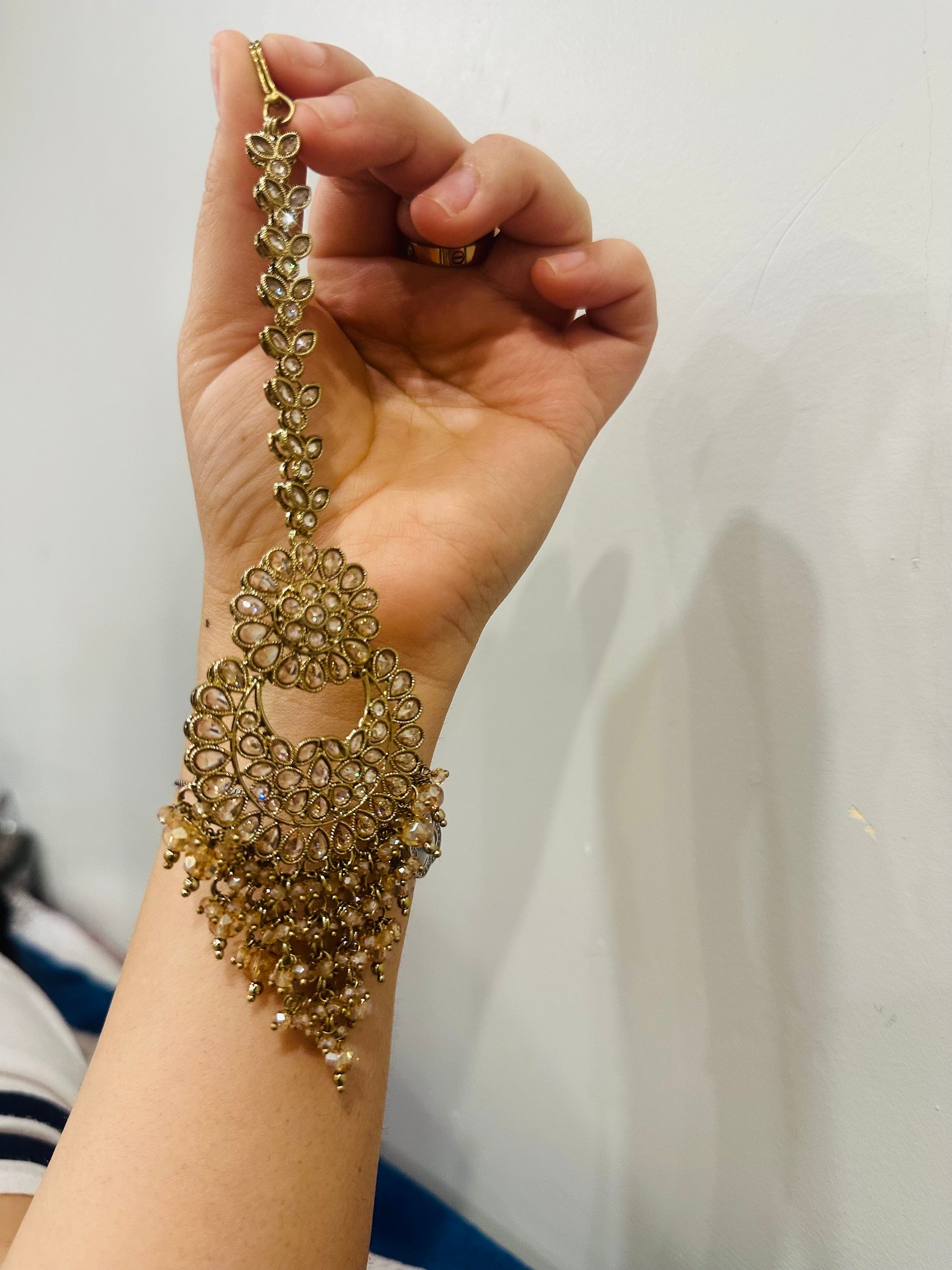 Enhance your elegant look with our Navya mangtika. Made with high quality polki, this versatile piece can be worn as both a mangtika and a pasa, giving you the option to switch up your style. Elevate your ensemble with this stunning addition.