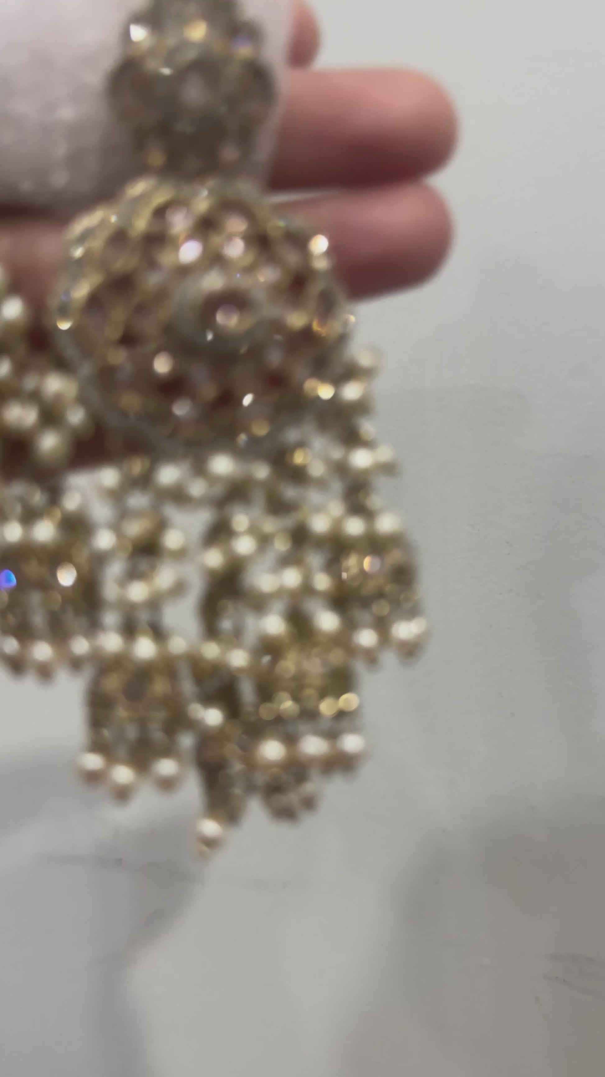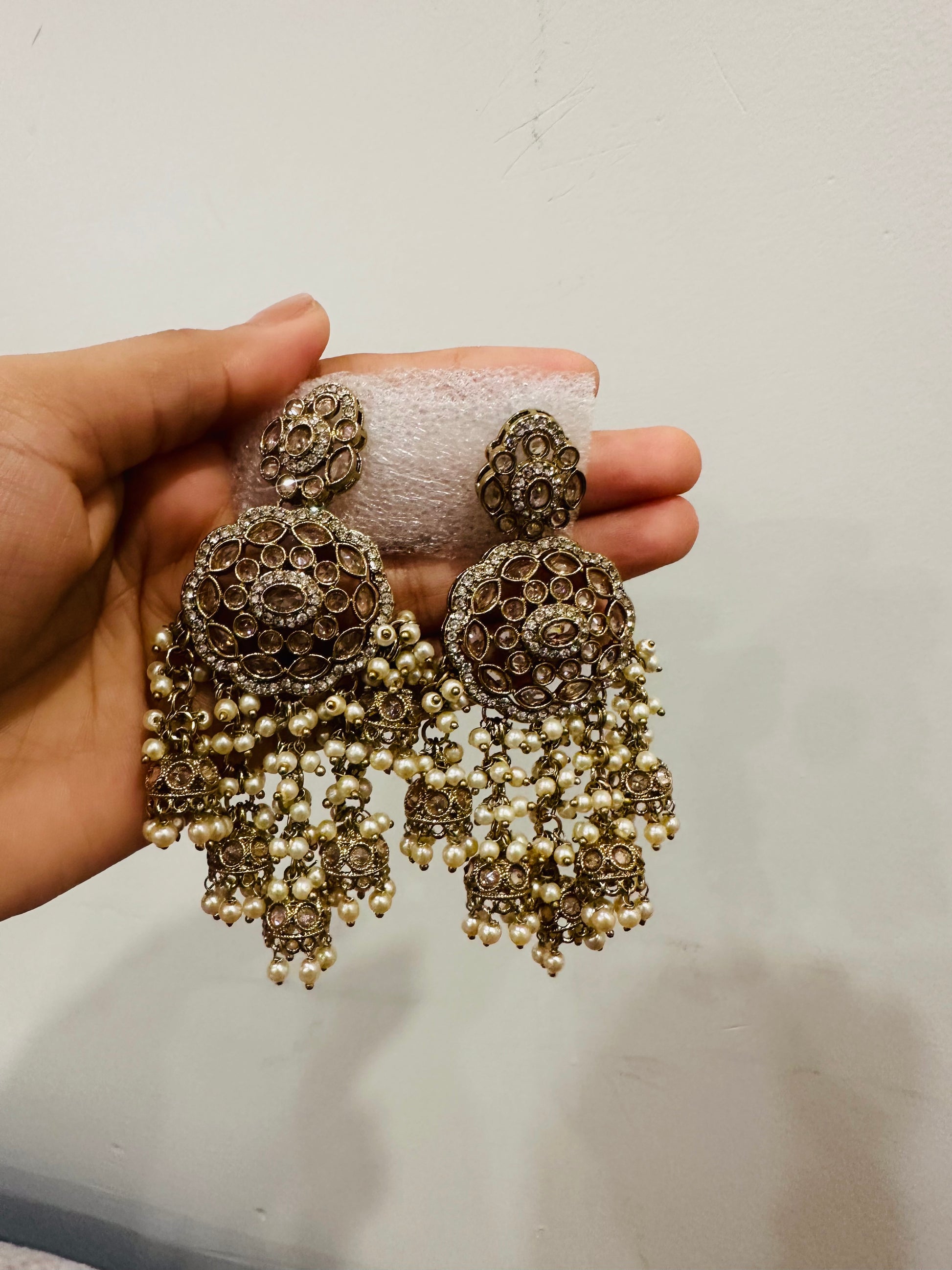 These stunning Navya polki earrings feature precious stones and are perfect for pairing with saree suits. The dangling design adds an elegant touch to any outfit. Elevate your style with these high-quality, polished earrings.